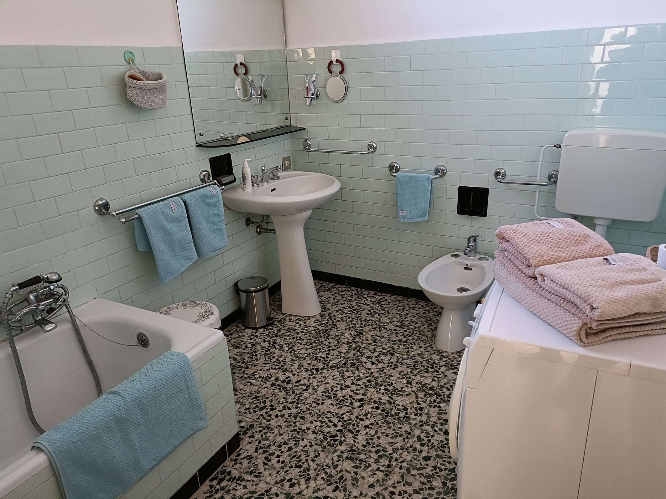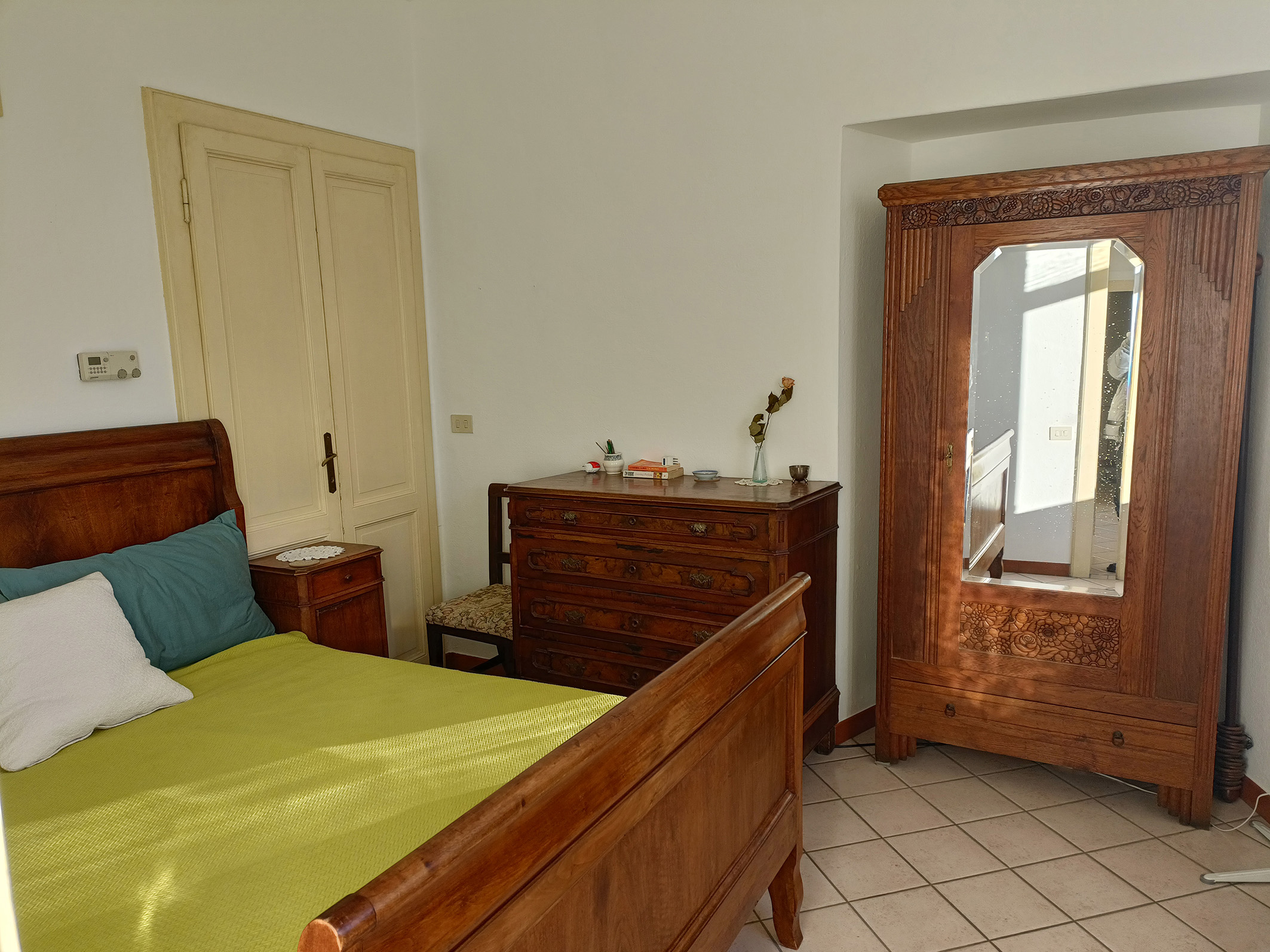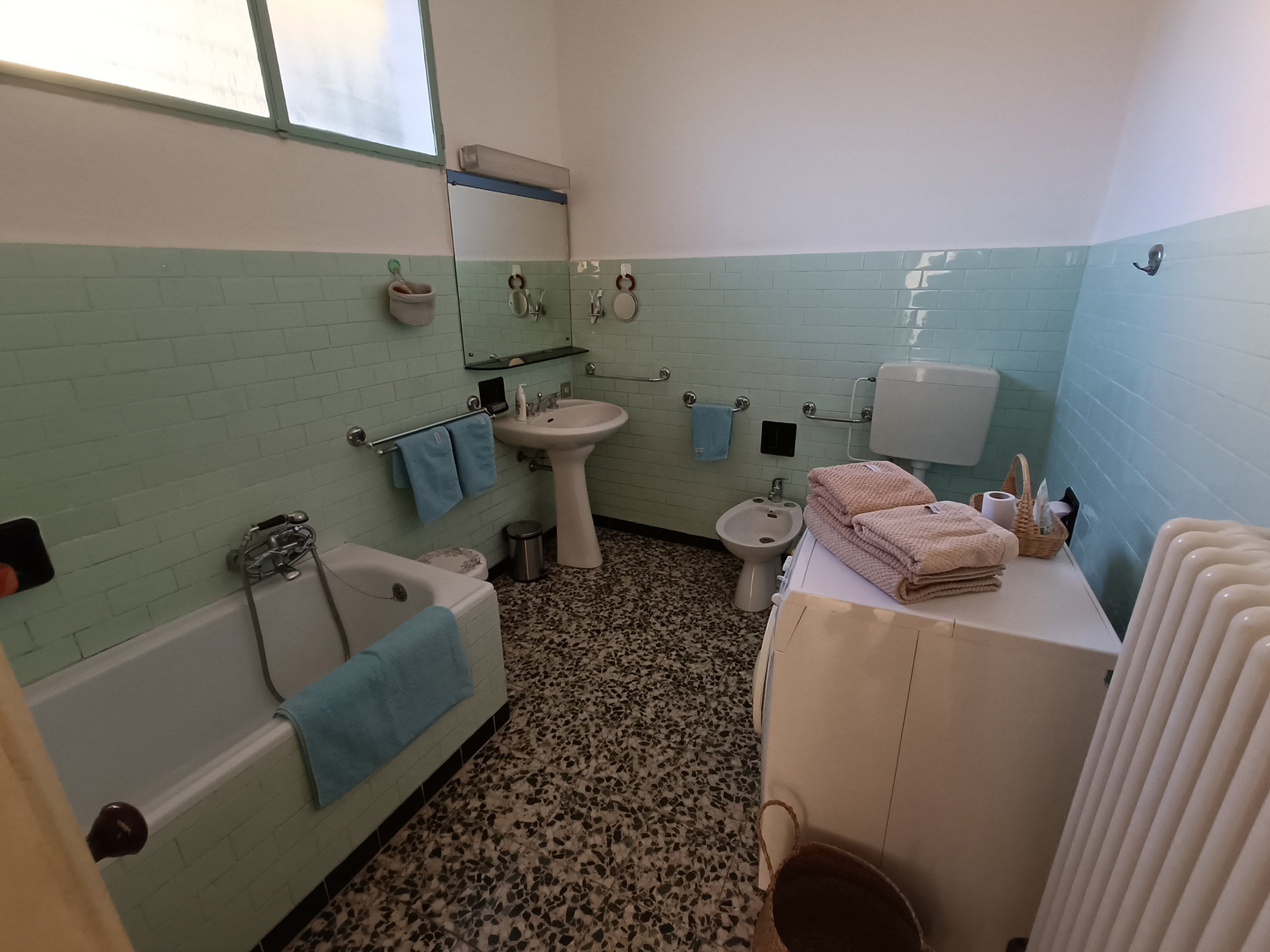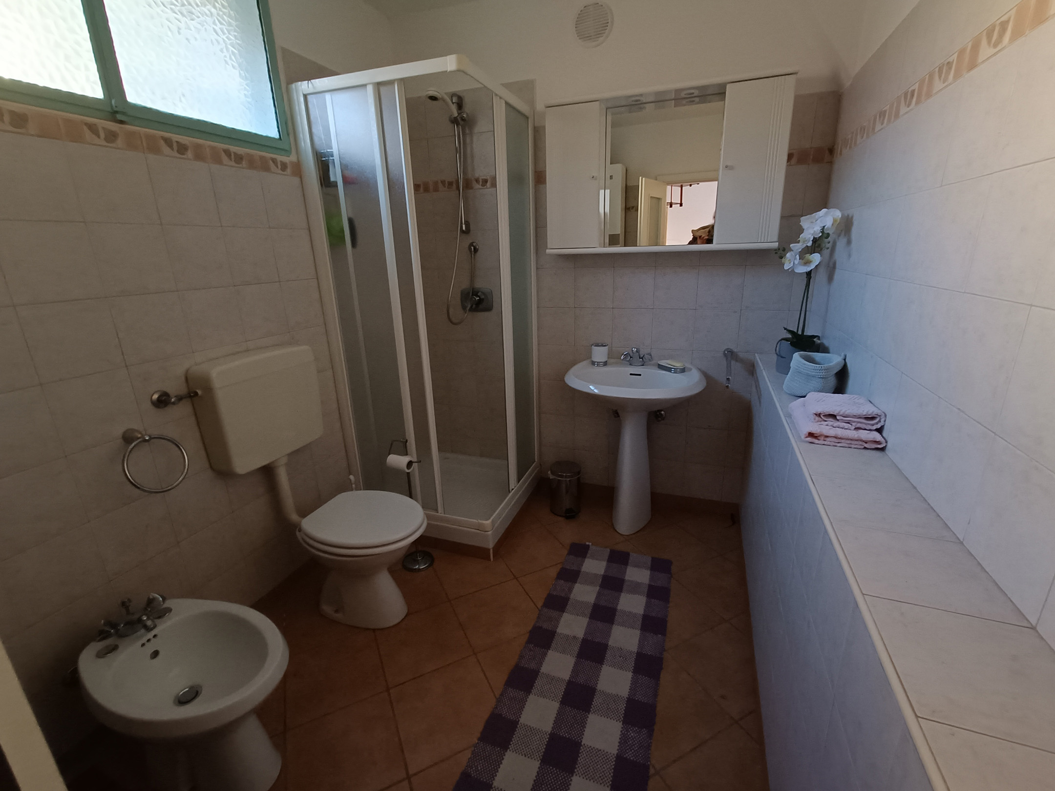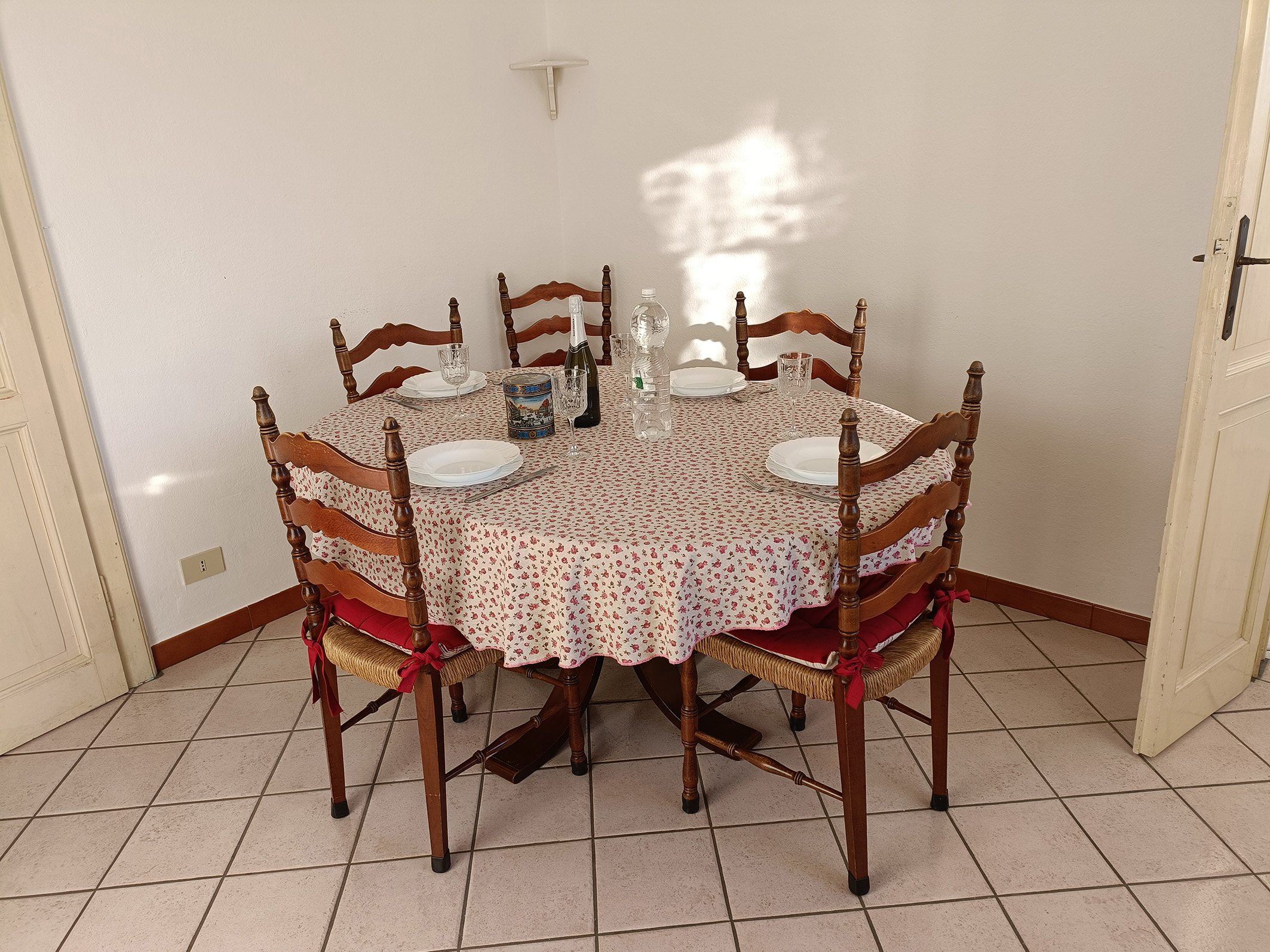 The apartment, with a surface area of over 100 m², consists on the upper floor of a bright living room with a double sofa bed and an adjoining small, rustic dining room, a functional kitchen, a bathroom with built-in bathtub and 2 bedrooms; on the lower floor there is only a small bathroom and next to it a bedroom, providing a total of 6/7 sleeping places.