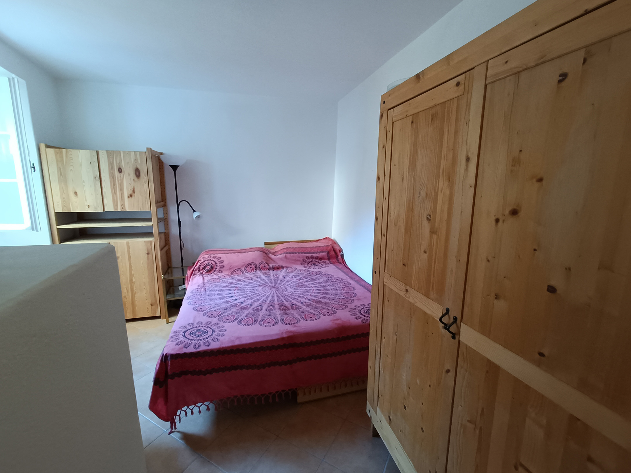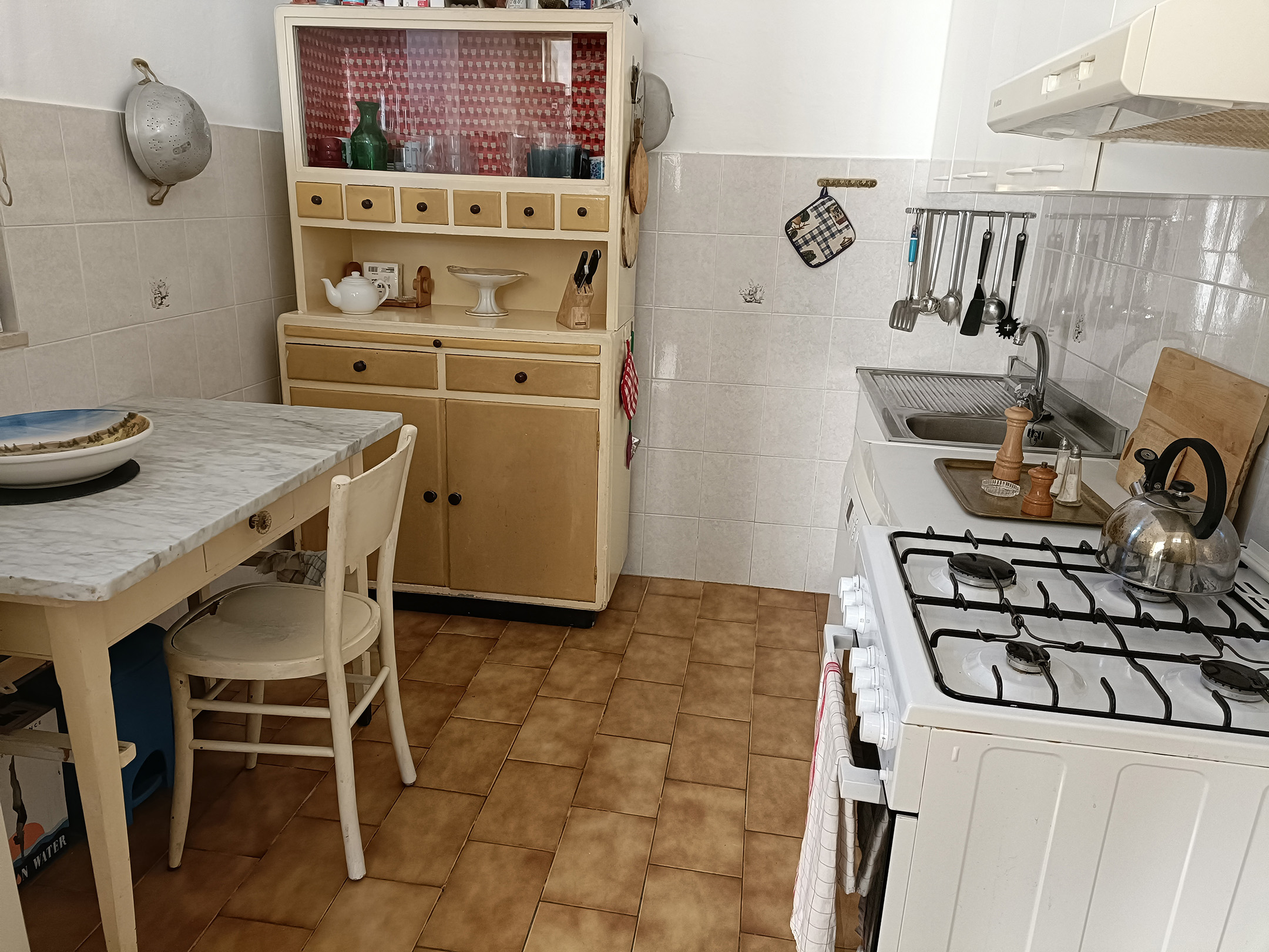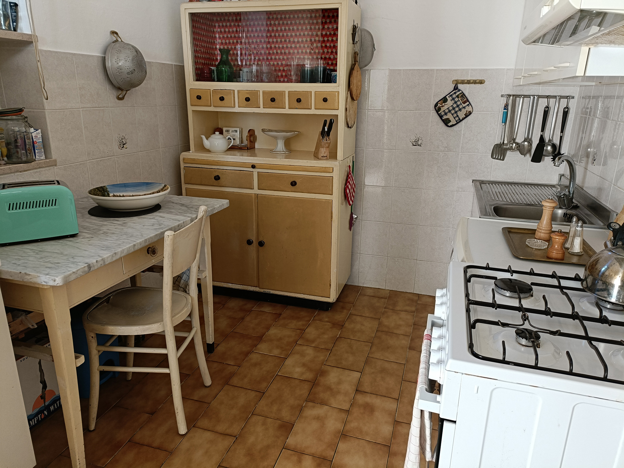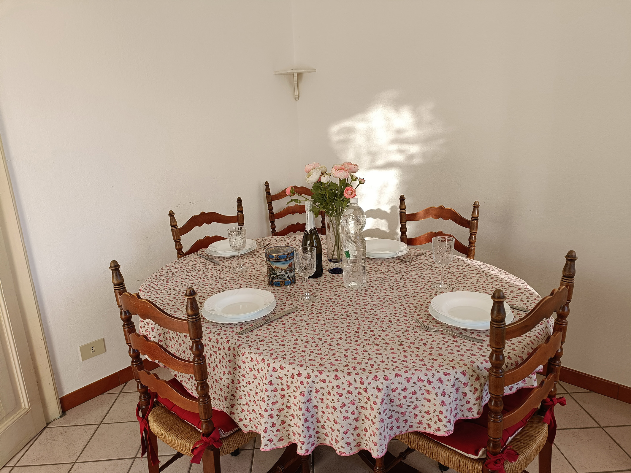 The apartment, with a surface area of over 100 m², consists on the upper floor of a bright living room with a double sofa bed and an adjoining small, rustic dining room, a functional kitchen, a bathroom with built-in bathtub and 2 bedrooms; on the lower floor there is only a small bathroom and next to it a bedroom, providing a total of 6/7 sleeping places.