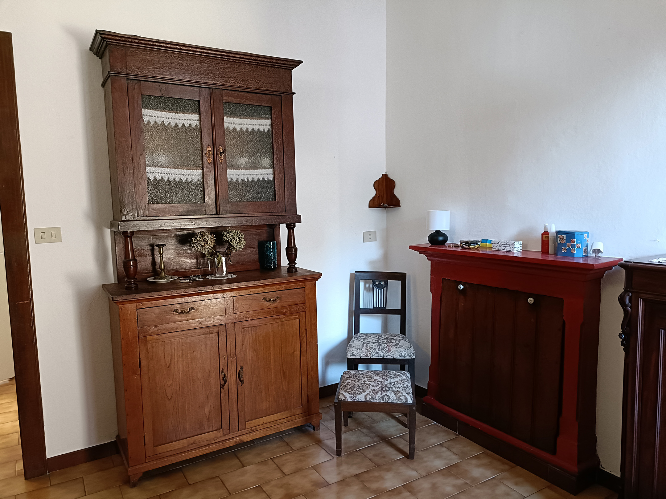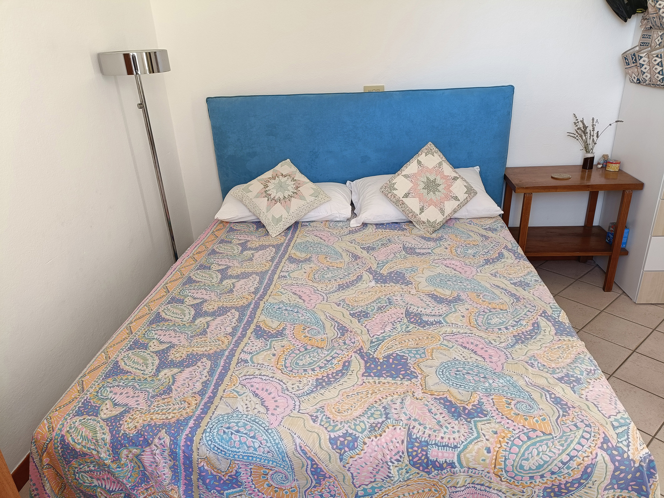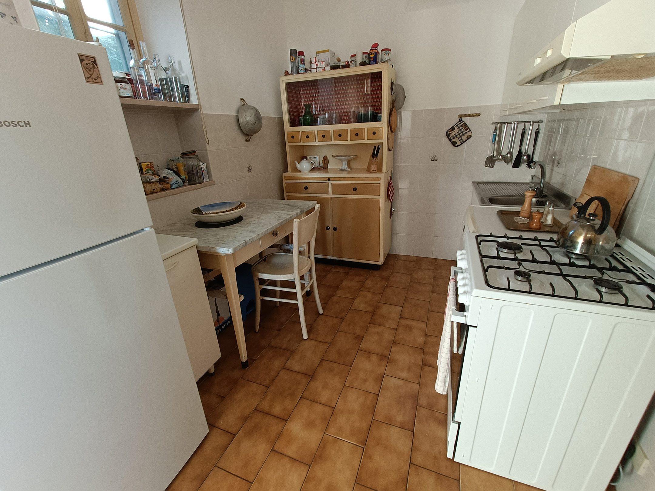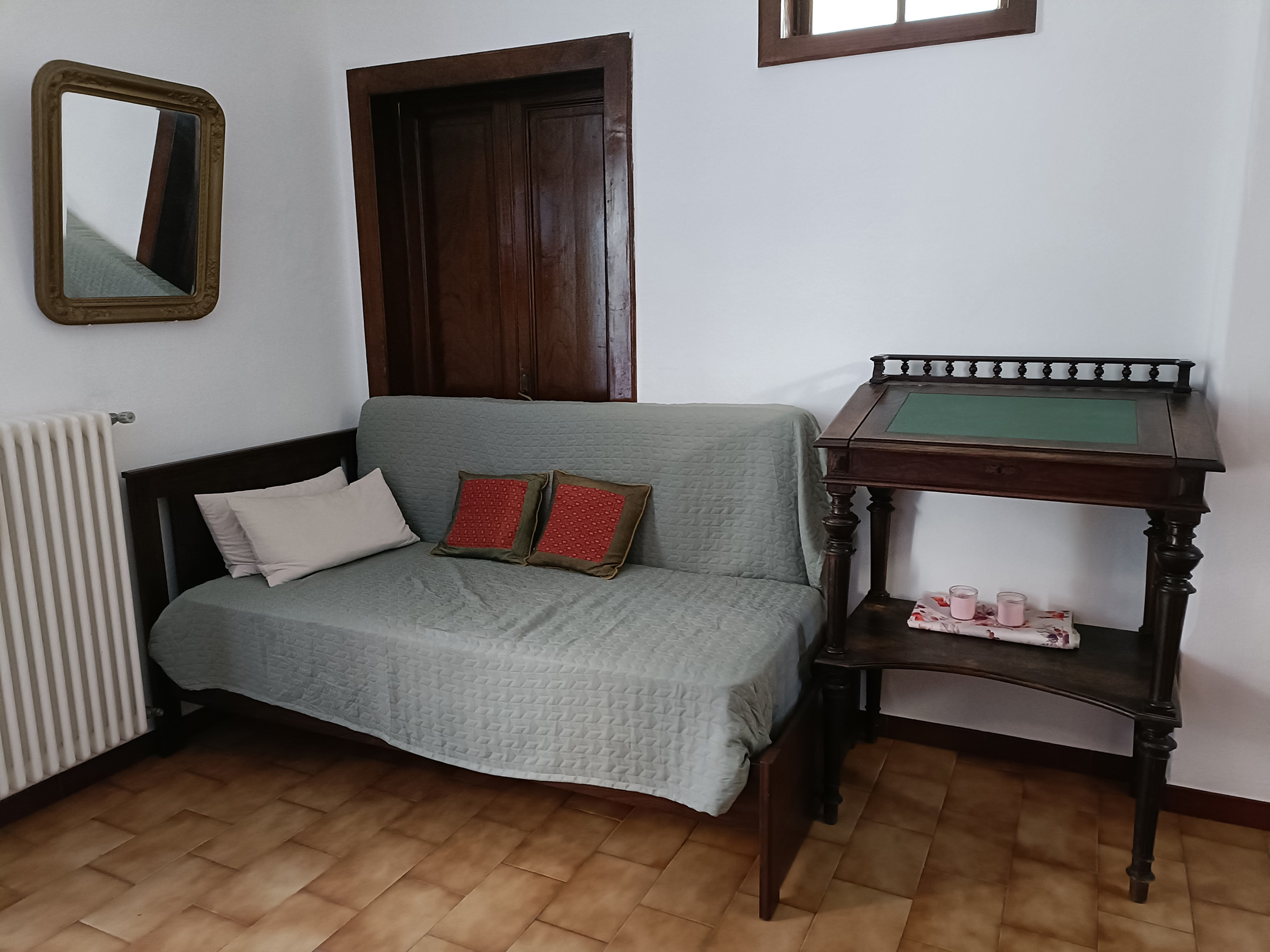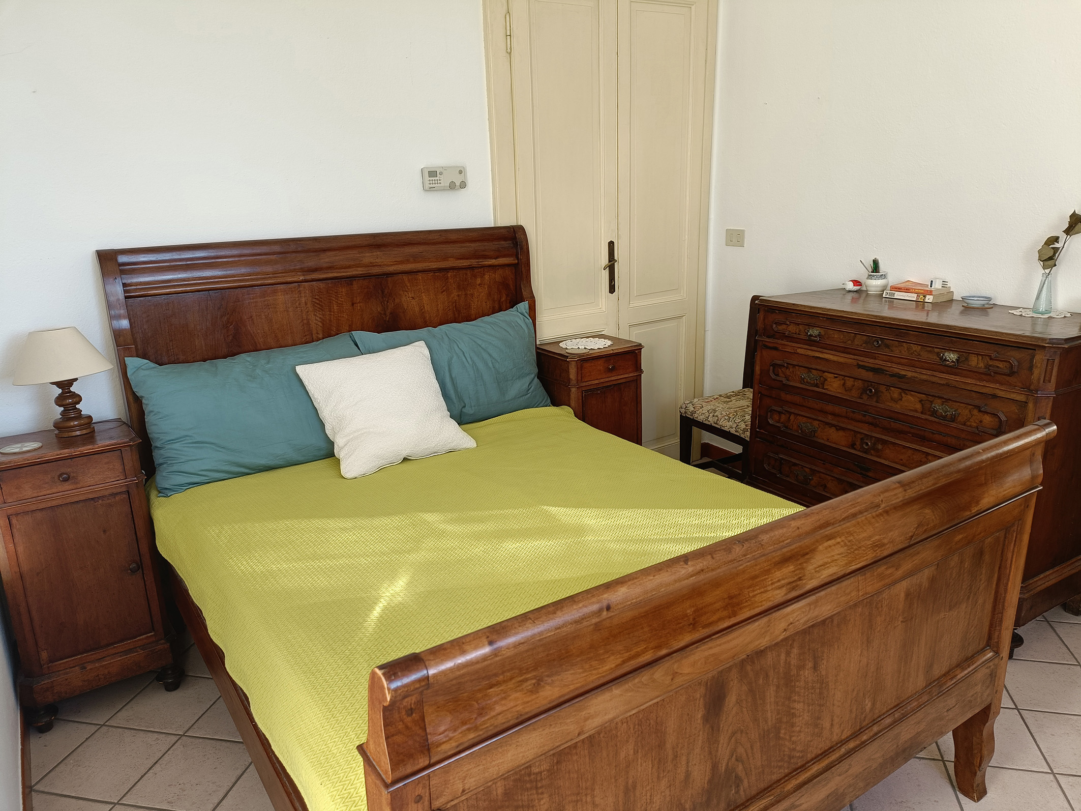 The apartment, with a surface area of over 100 m², consists on the upper floor of a bright living room with a double sofa bed and an adjoining small, rustic dining room, a functional kitchen, a bathroom with built-in bathtub and 2 bedrooms; on the lower floor there is only a small bathroom and next to it a bedroom, providing a total of 6/7 sleeping places.