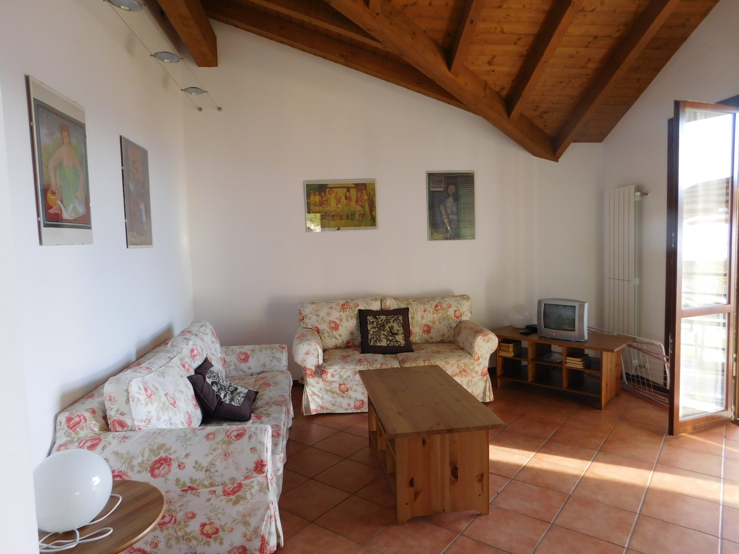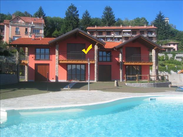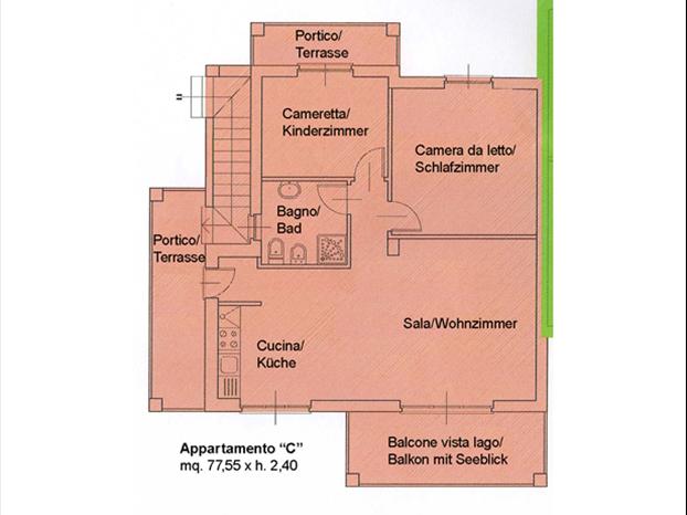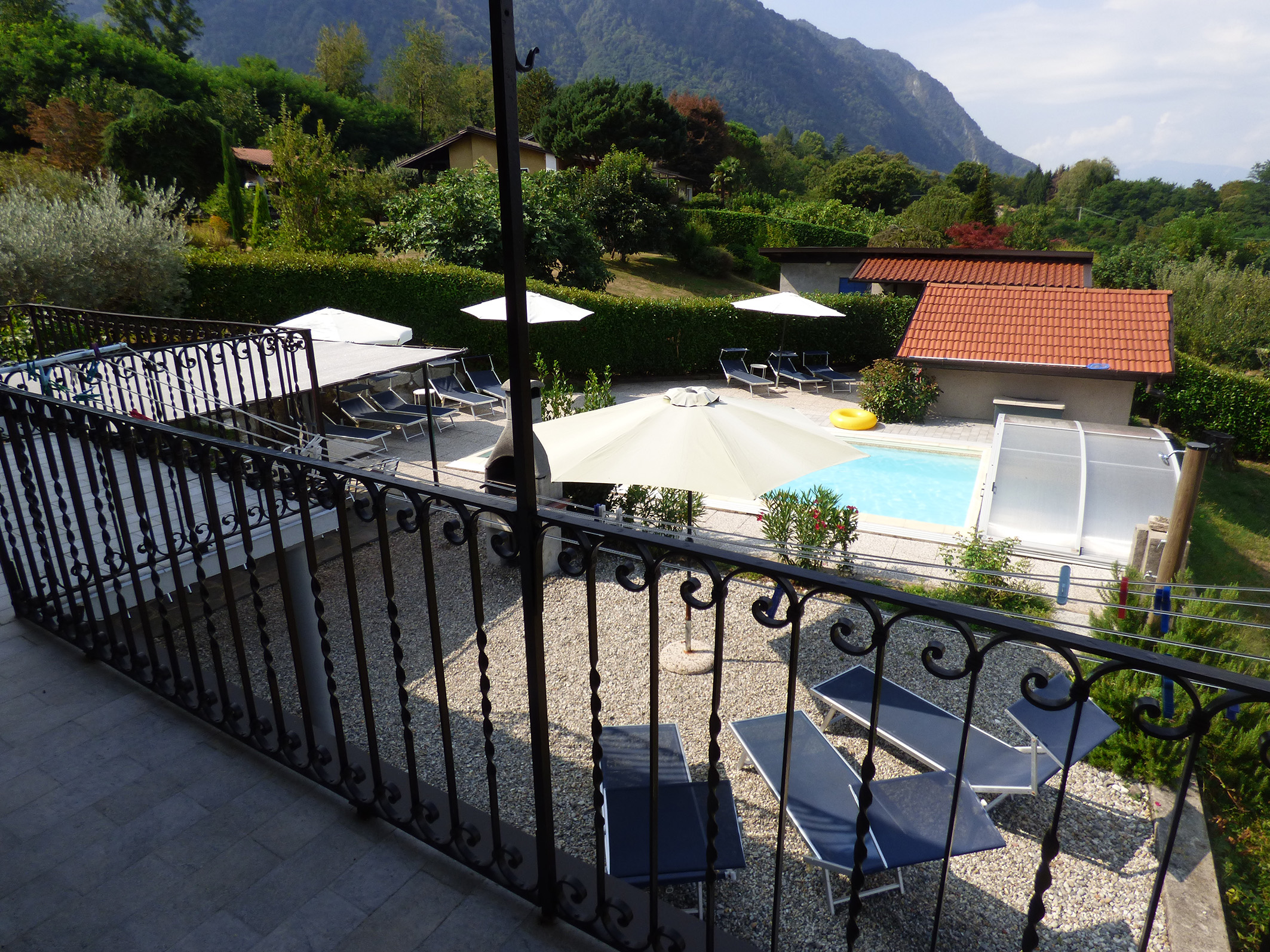 Outside, there is a private terrace overlooking the communal garden — ideal for outdoor meals or moments of relaxation — with direct access to a beautiful shared green area with lake view. Just a few steps away is the communal swimming pool, perfect for cooling off on summer days.