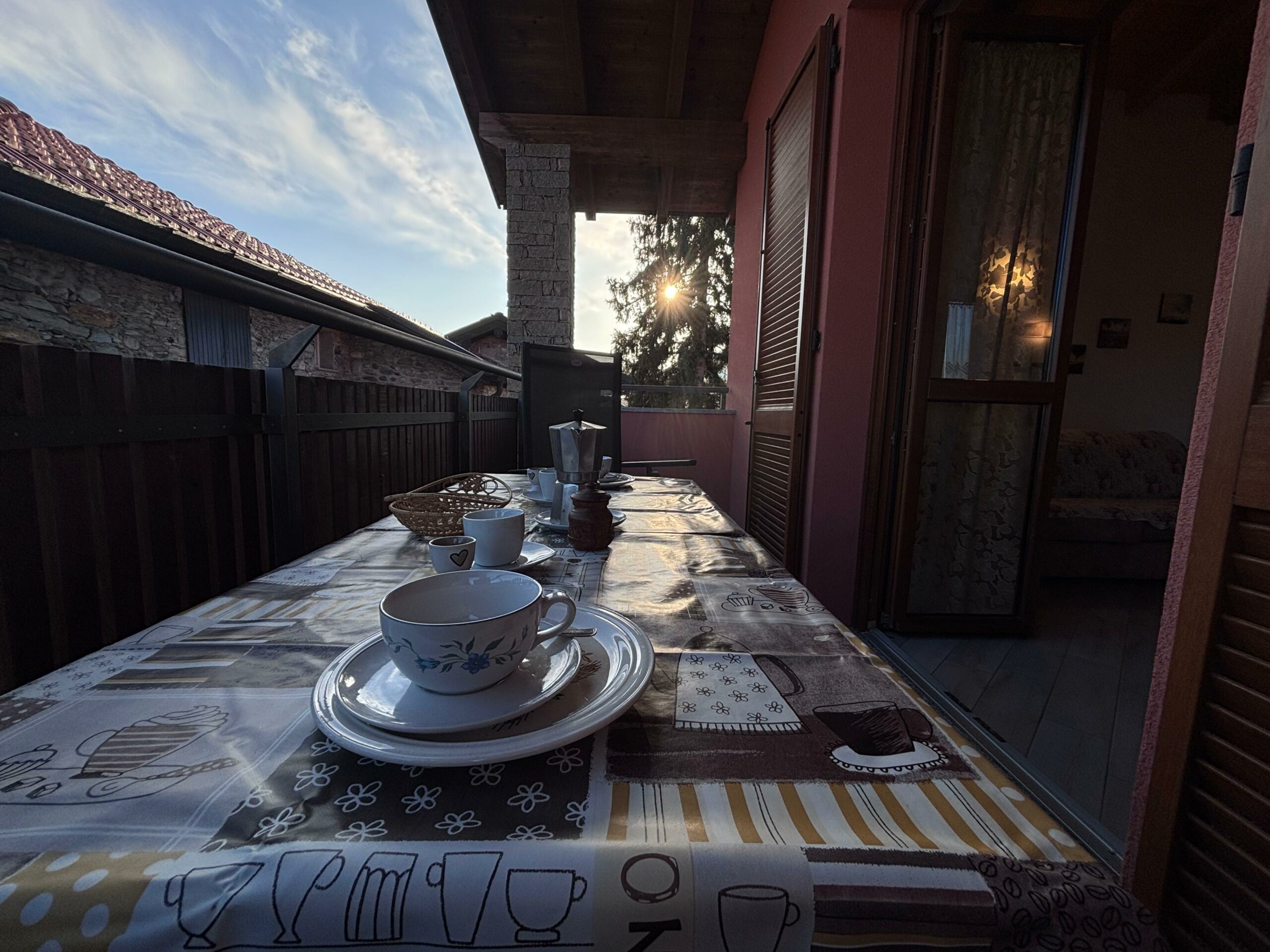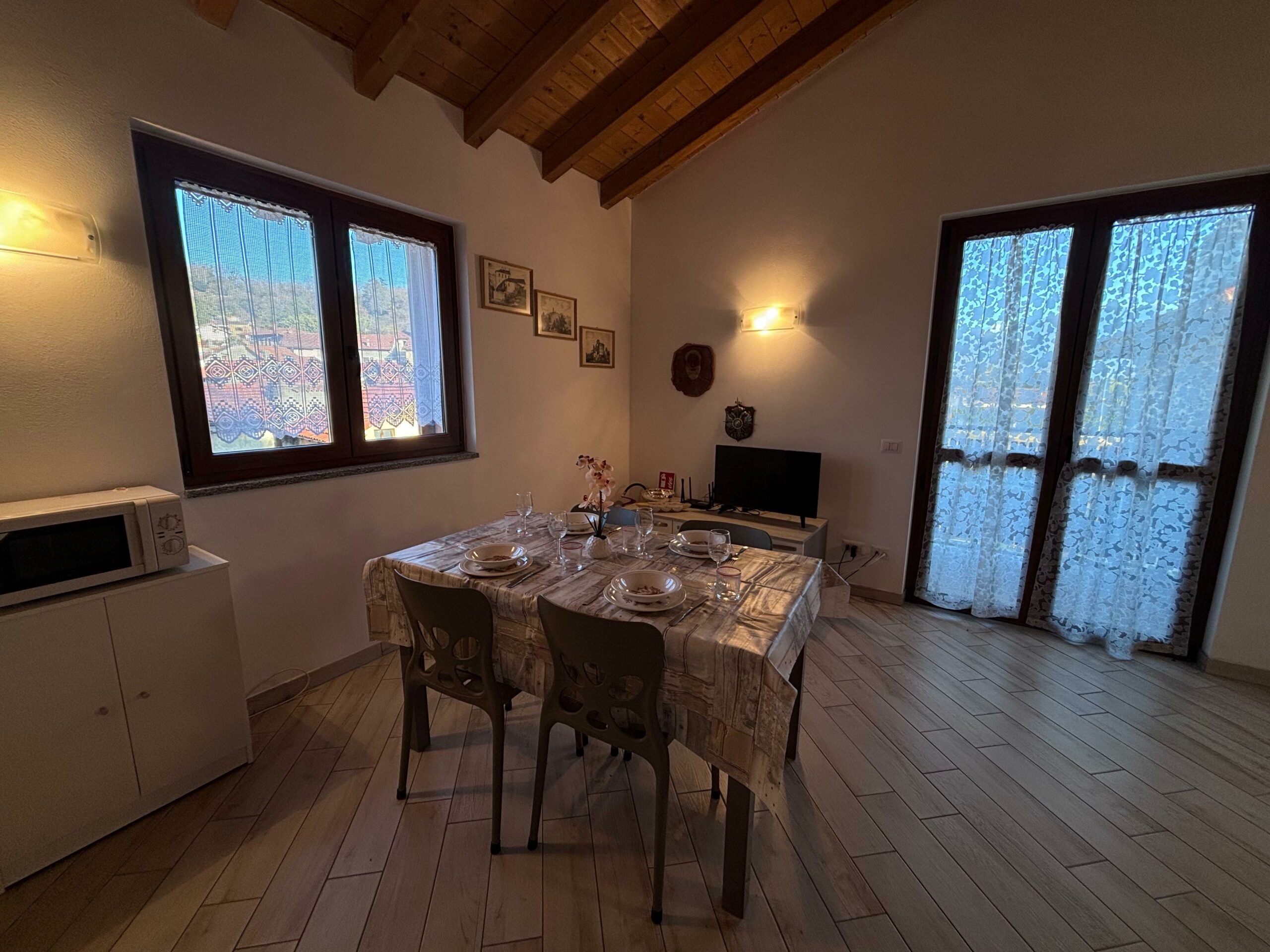 La casa è composta rispettivamente: un ampio salotto con cucina open space, completamente attrezzata, e un comodo tavolo da pranzo perfetto per condividere colazioni e cene in compagnia. La zona giorno si apre su un balcone panoramico, munito di tavolo e sedie, da cui ammirare la vista sul paesino e sulle montagne: un angolo ideale per rilassarsi all’aria aperta.