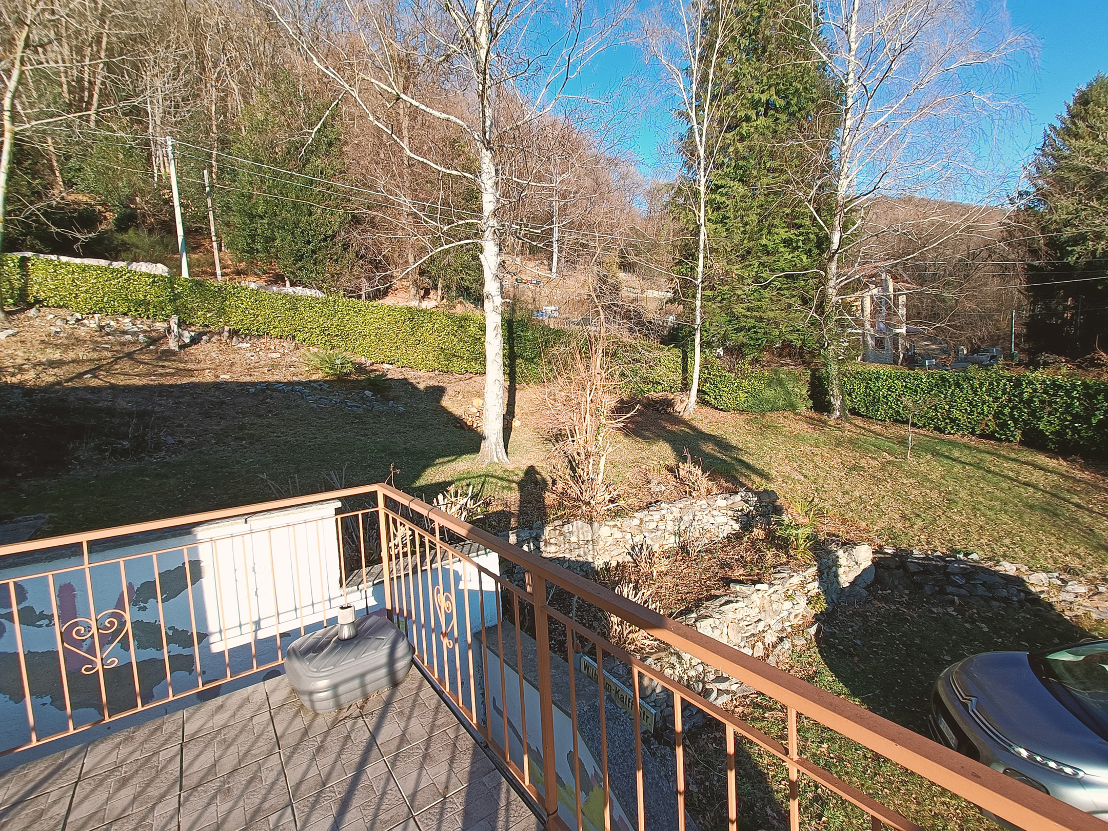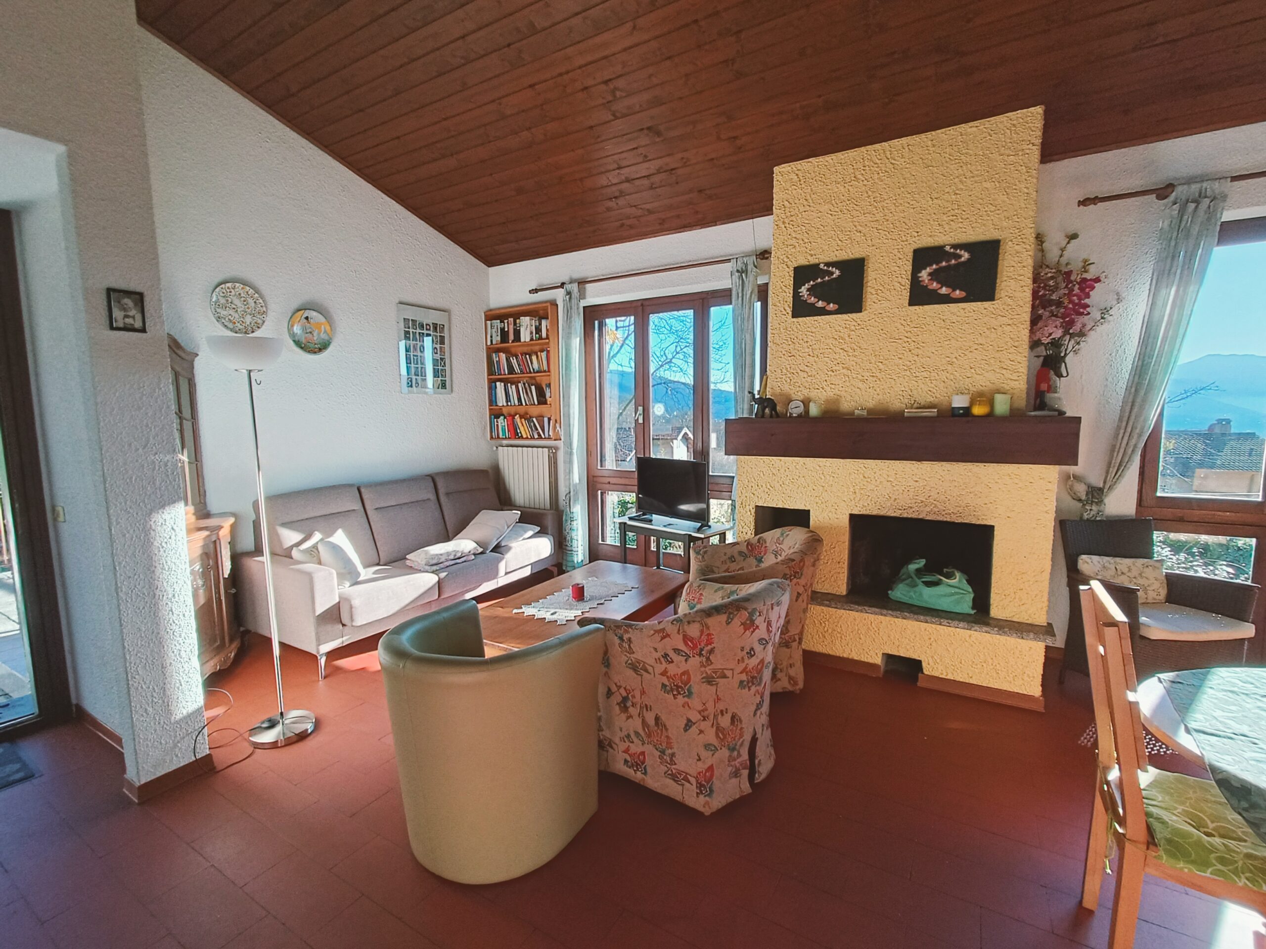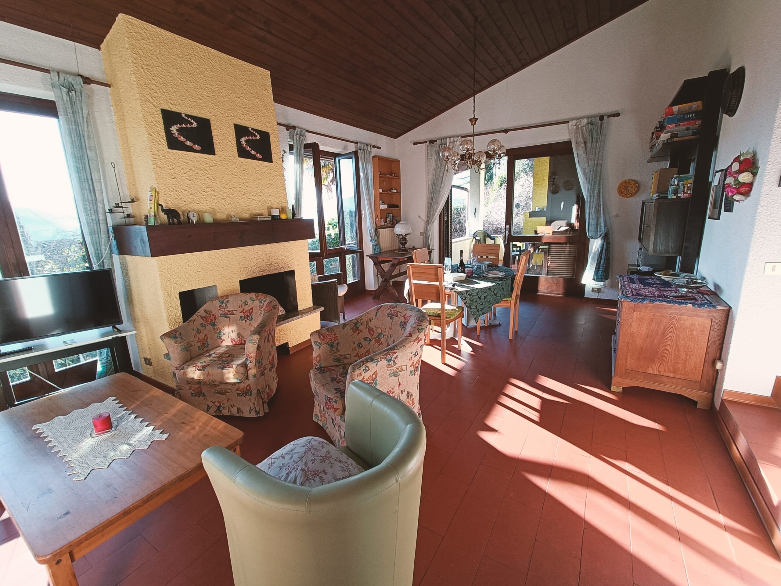 L’area esterna, composta come già detto da un grazioso e ampio giardino e da una terrazza laterale con vista panoramica, comprende anche una meravigliosa terrazza coperta, costantemente illuminata dalla luce del sole e dotata di camino (con barbecue) e di un grande tavolo da pranzo con sedie.