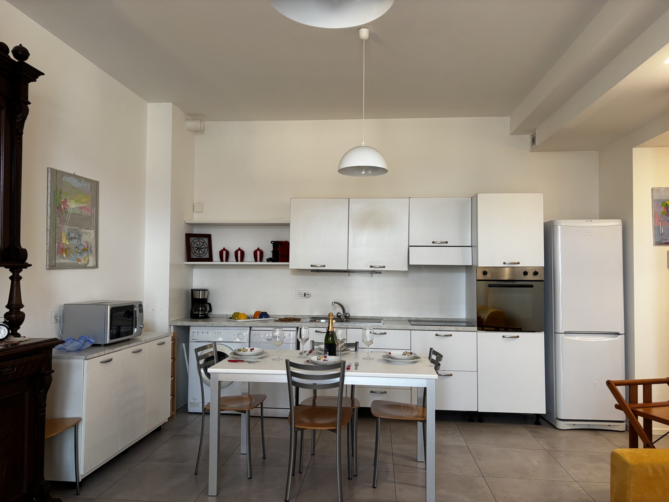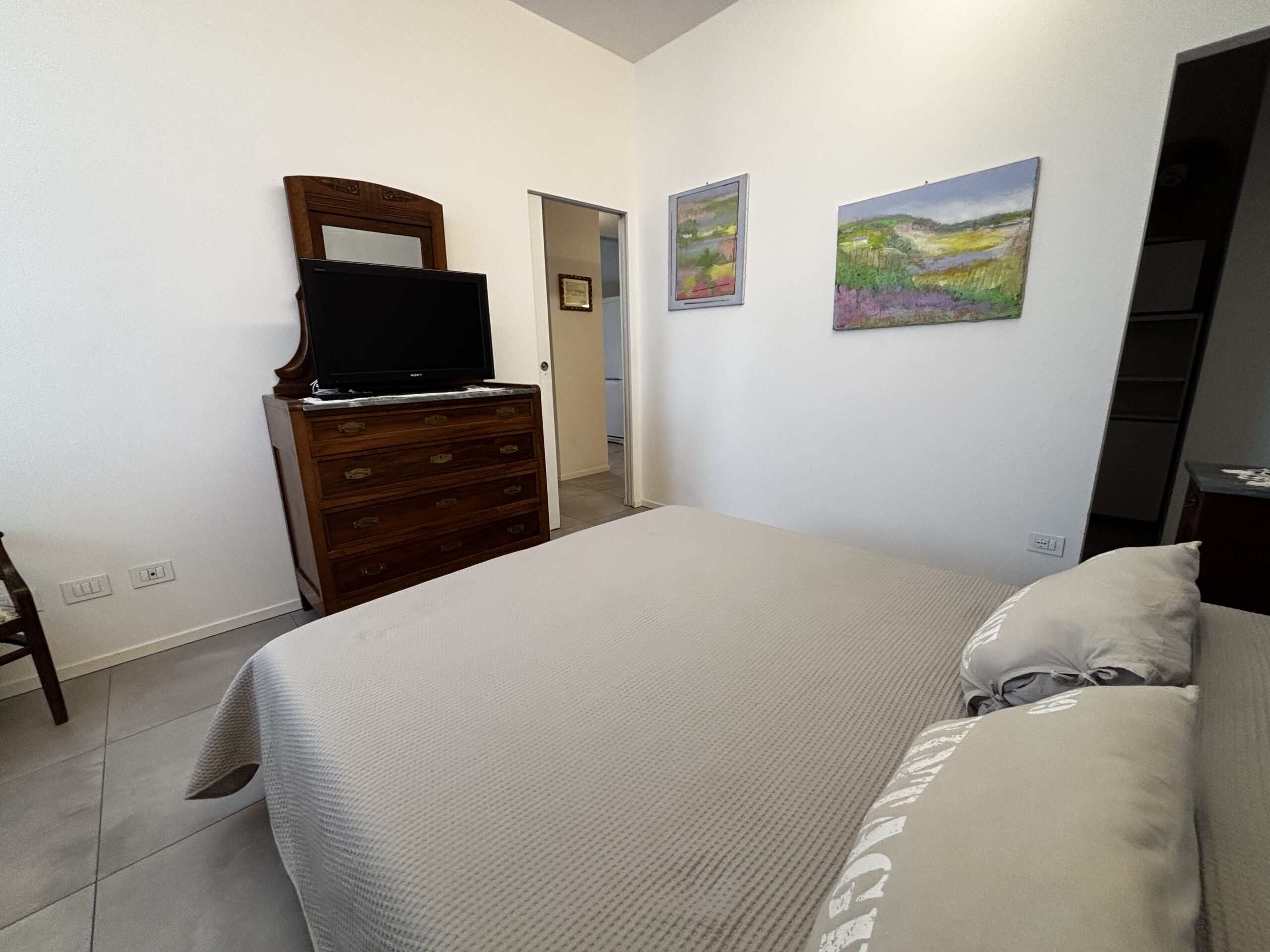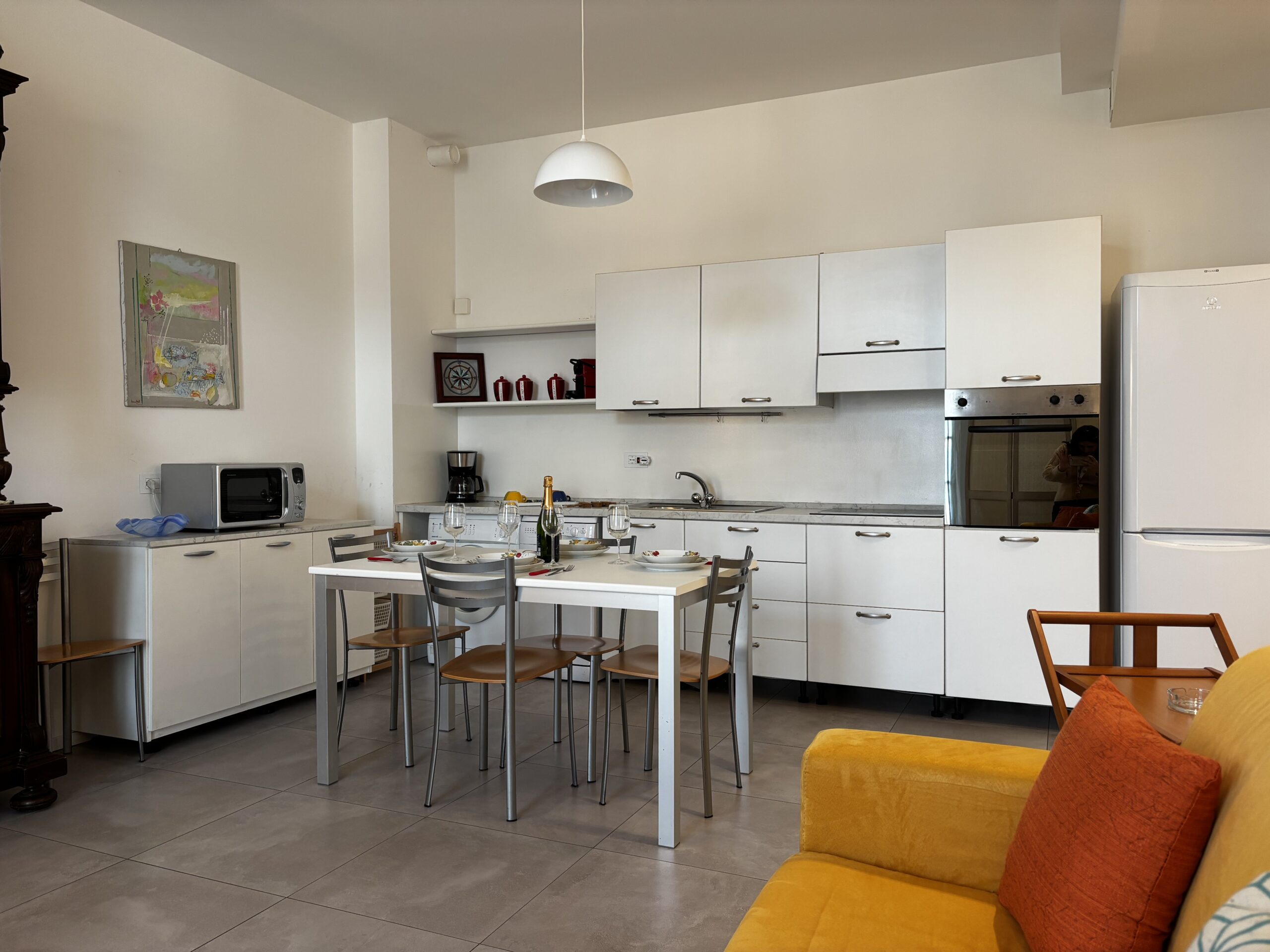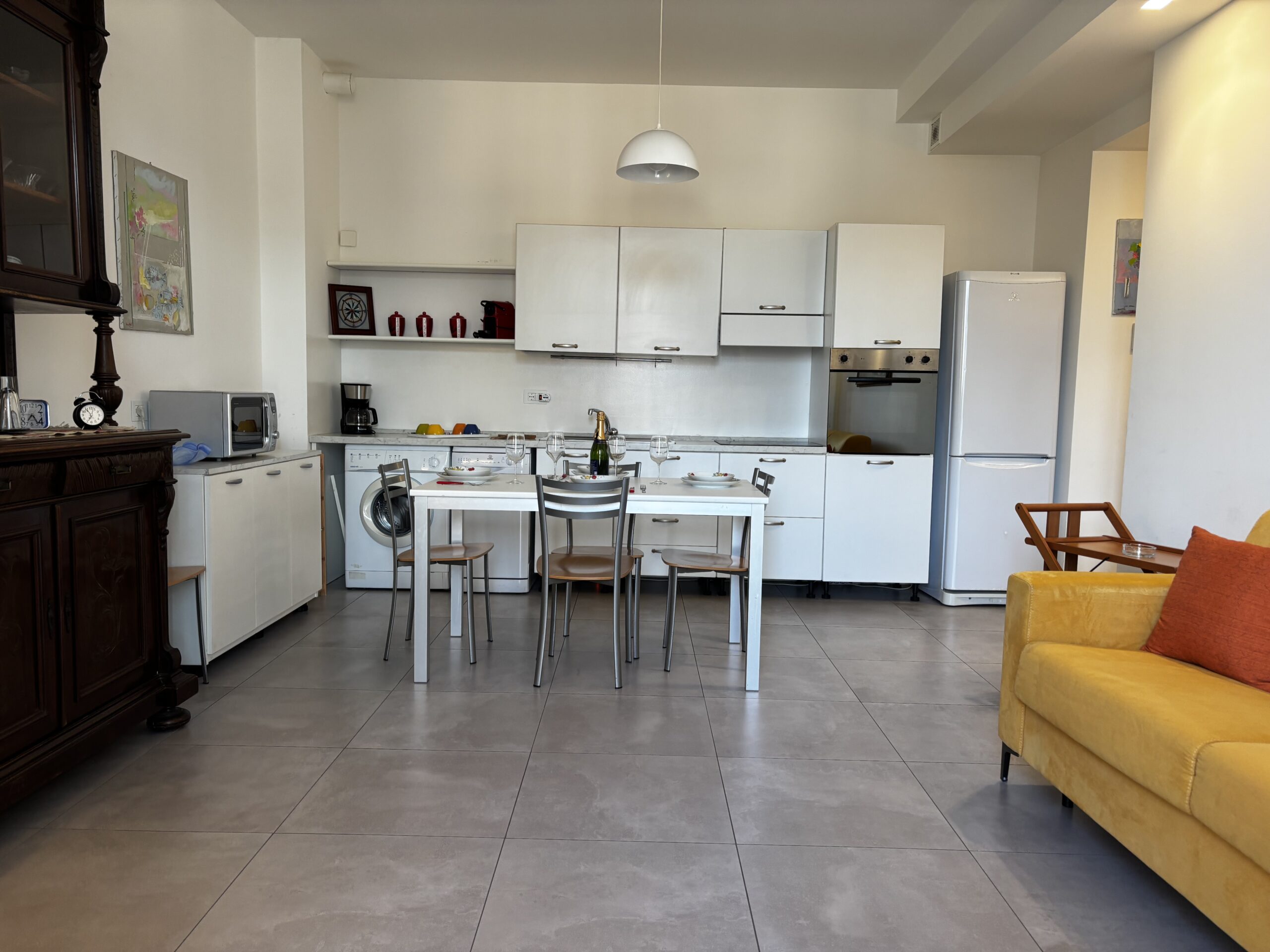 Im zweiten Stock von Casa Al Parco befindet sich eine charmante, geschmackvoll eingerichtete Zweizimmerwohnung mit einer Fläche von 60 m², bestehend aus einem großen Wohnzimmer mit einem Doppelschlafsofa und einer einfachen, aber gut ausgestatteten Küchenzeile, einem einfachen Badezimmer und einem Schlafzimmer mit Einbauschrank, also insgesamt 4 Betten. Der Außenbereich besteht aus einem kleinen Balkon mit Blick auf den großen öffentlichen Park „il Boschetto“, einem sehr kühler und schattiger Platz, der besonders für Familien mit Kindern geeignet ist.