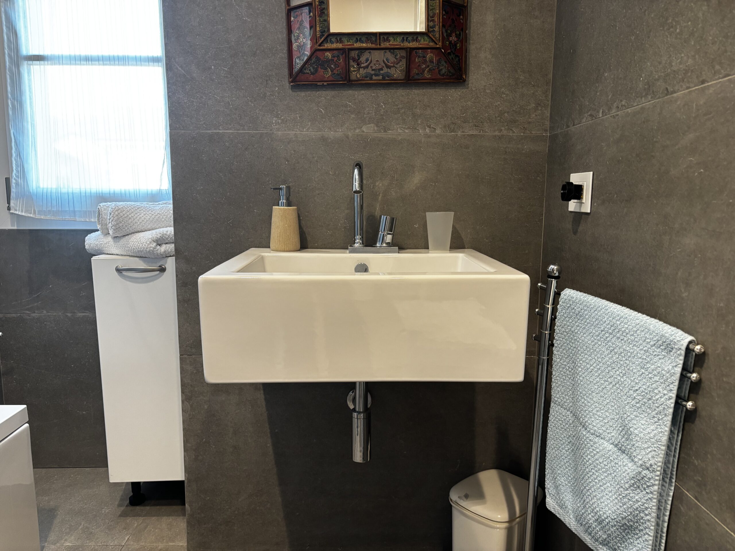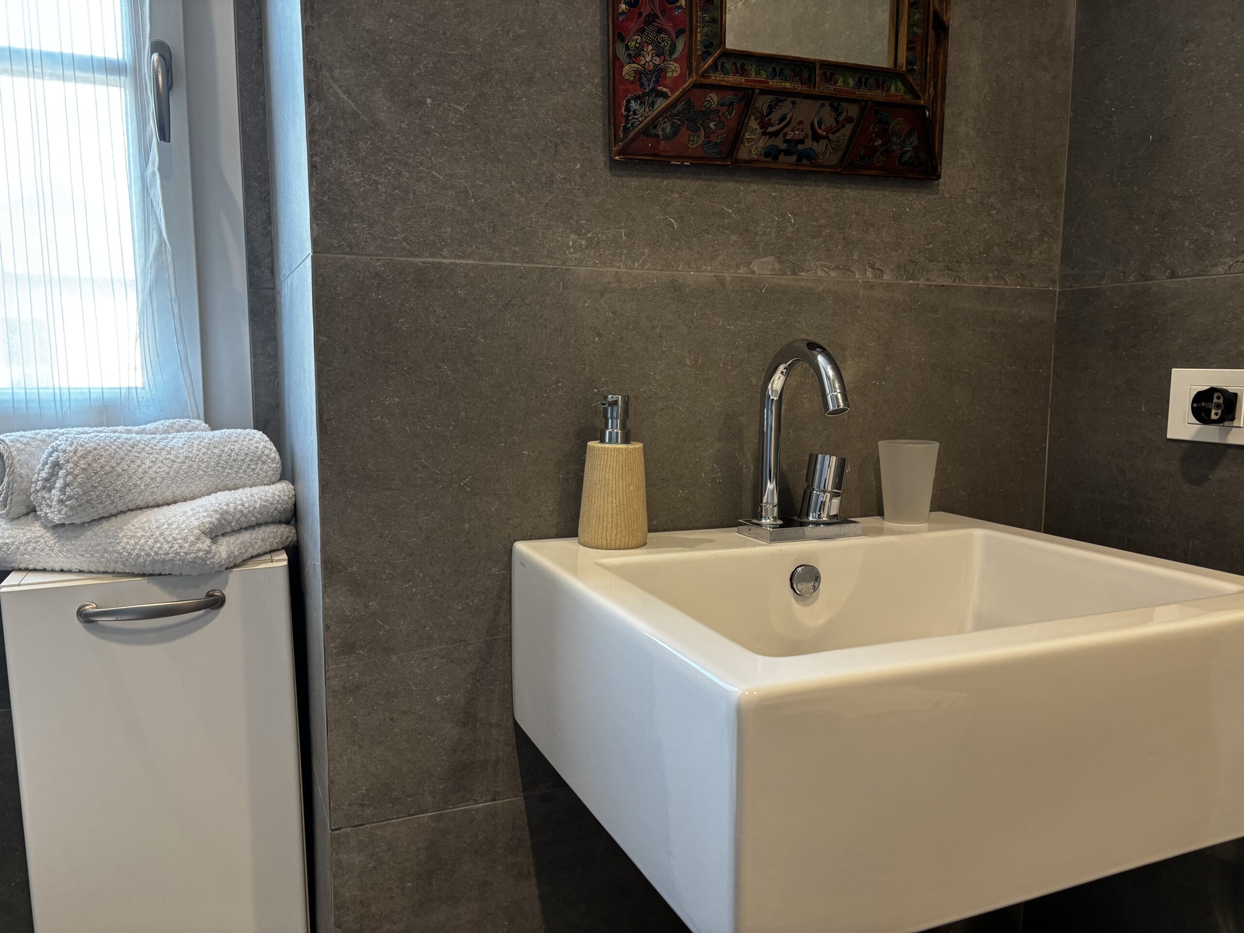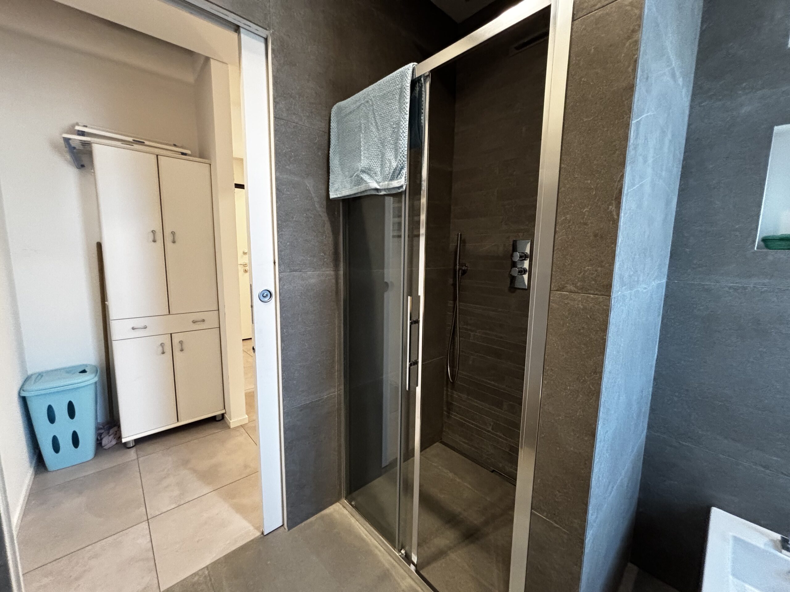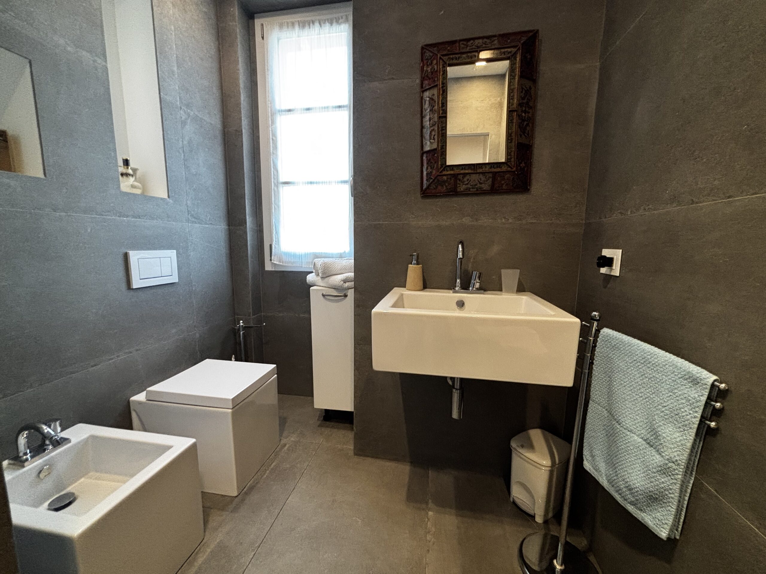Im zweiten Stock von Casa Al Parco befindet sich eine charmante, geschmackvoll eingerichtete Zweizimmerwohnung mit einer Fläche von 60 m², bestehend aus einem großen Wohnzimmer mit einem Doppelschlafsofa und einer einfachen, aber gut ausgestatteten Küchenzeile, einem einfachen Badezimmer und einem Schlafzimmer mit Einbauschrank, also insgesamt 4 Betten. Der Außenbereich besteht aus einem kleinen Balkon mit Blick auf den großen öffentlichen Park „il Boschetto“, einem sehr kühler und schattiger Platz, der besonders für Familien mit Kindern geeignet ist.