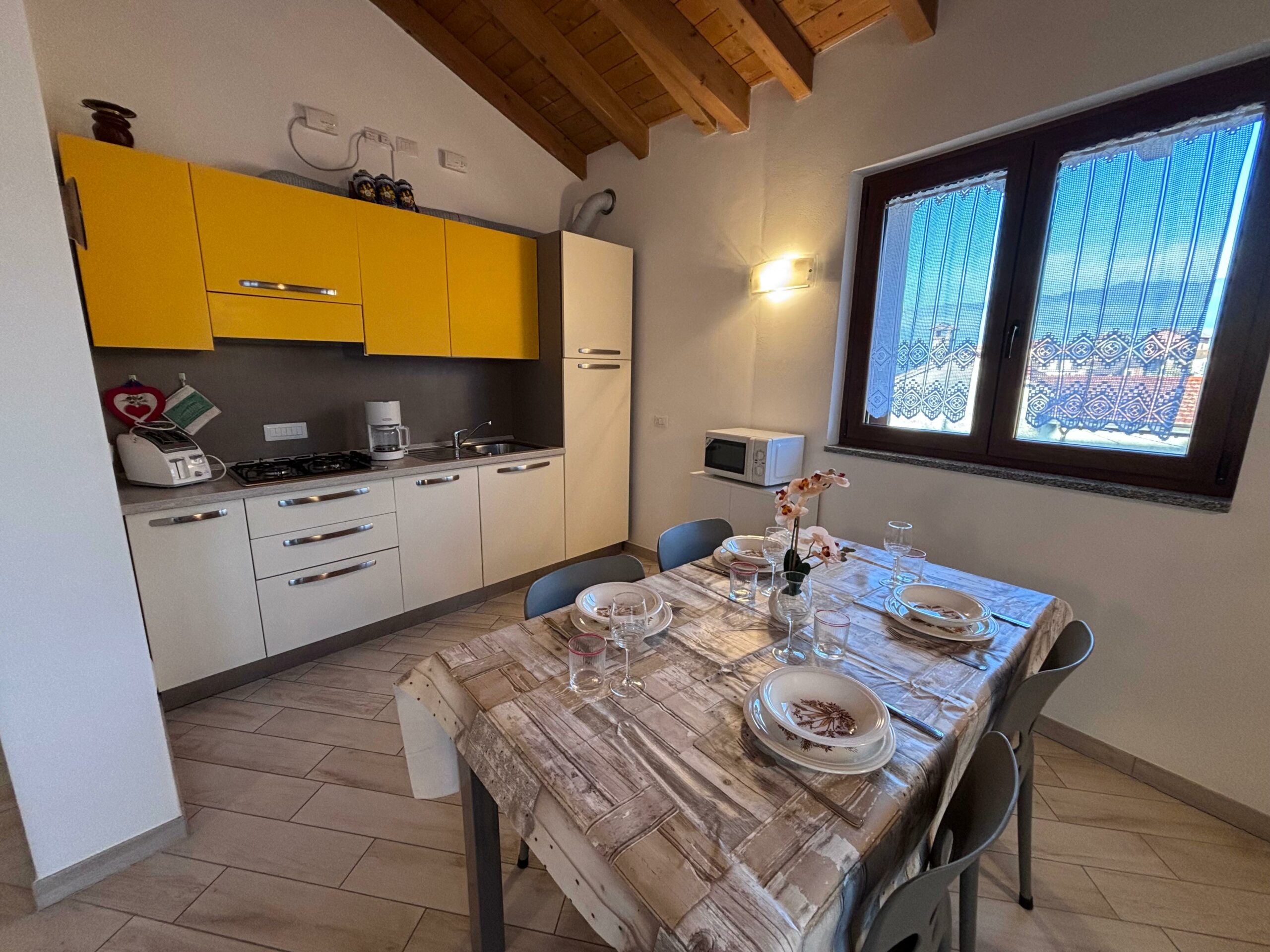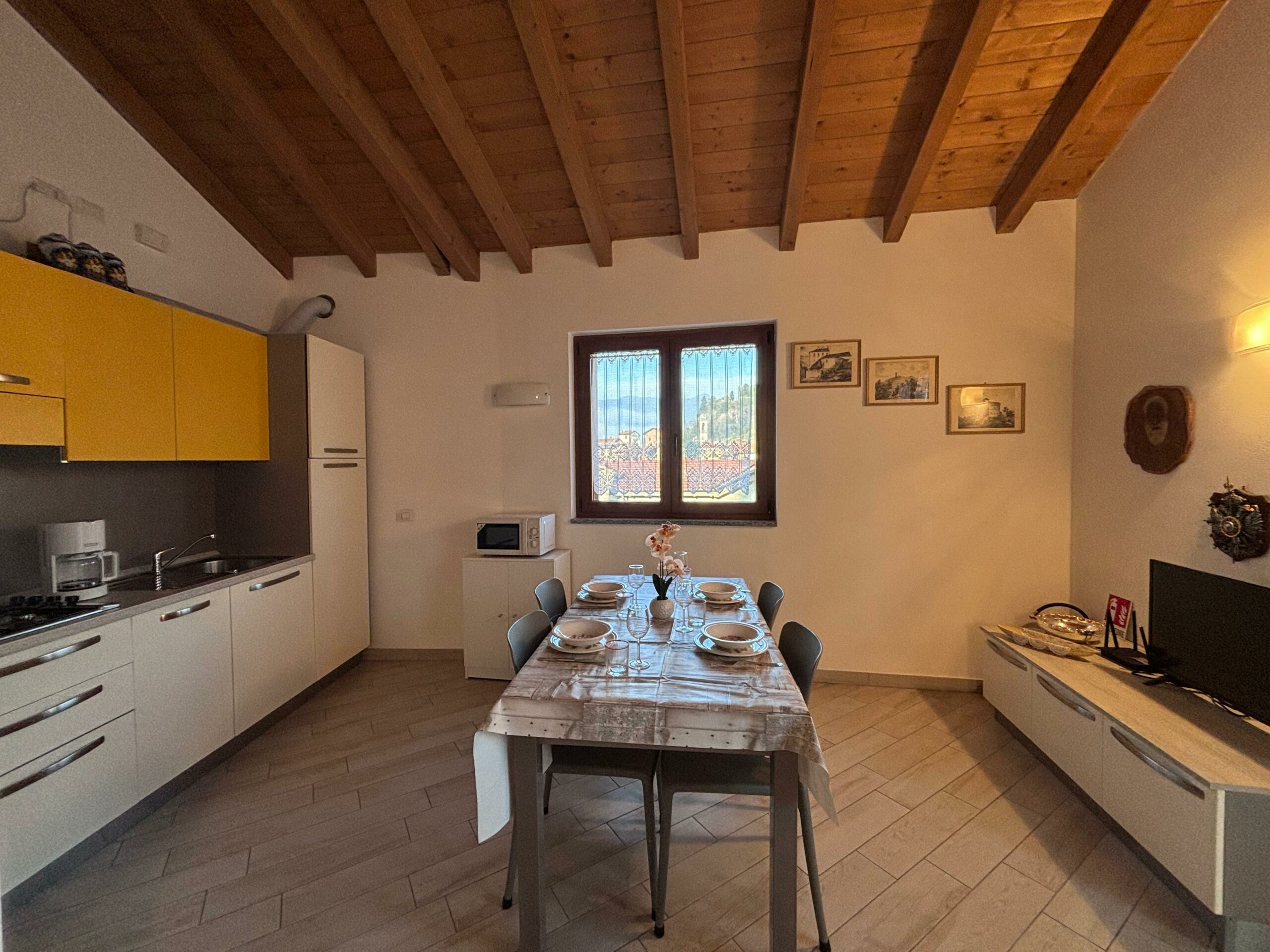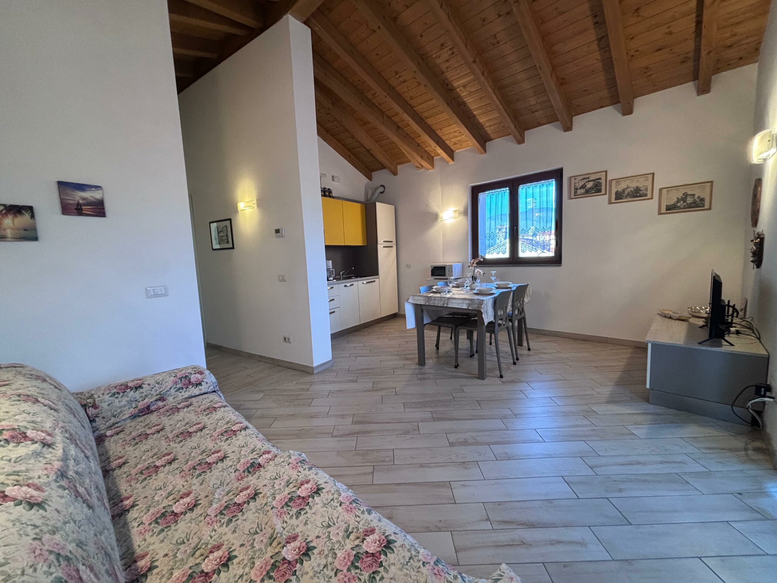Das Haus besteht aus einem großen Wohnzimmer mit einer voll ausgestatteten offenen Küche und einem bequemen Esstisch, der sich perfekt für gemeinsames Frühstück und Abendessen eignet. Der Wohnbereich öffnet sich zu einem Panoramabalkon mit Tisch und Stühlen, von dem aus man den Blick auf das Dorf und die Berge genießen kann: ein idealer Ort, um sich an der frischen Luft zu entspannen.