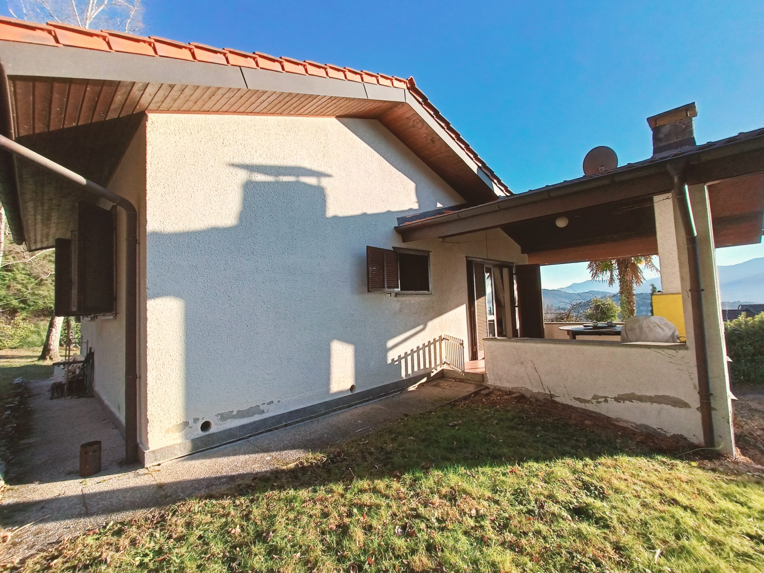 Der Außenbereich, der wie bereits erwähnt aus einem reizvollen und weitläufigen Garten und einer Seitenterrasse mit Panoramablick besteht, umfasst außerdem eine wunderbare, überdachte Terrasse, die ständig vom Sonnenlicht erhellt wird und mit einem offenen Kamin (inkl. Grill) sowie einem großen Esstisch und Stühlen ausgestattet ist.