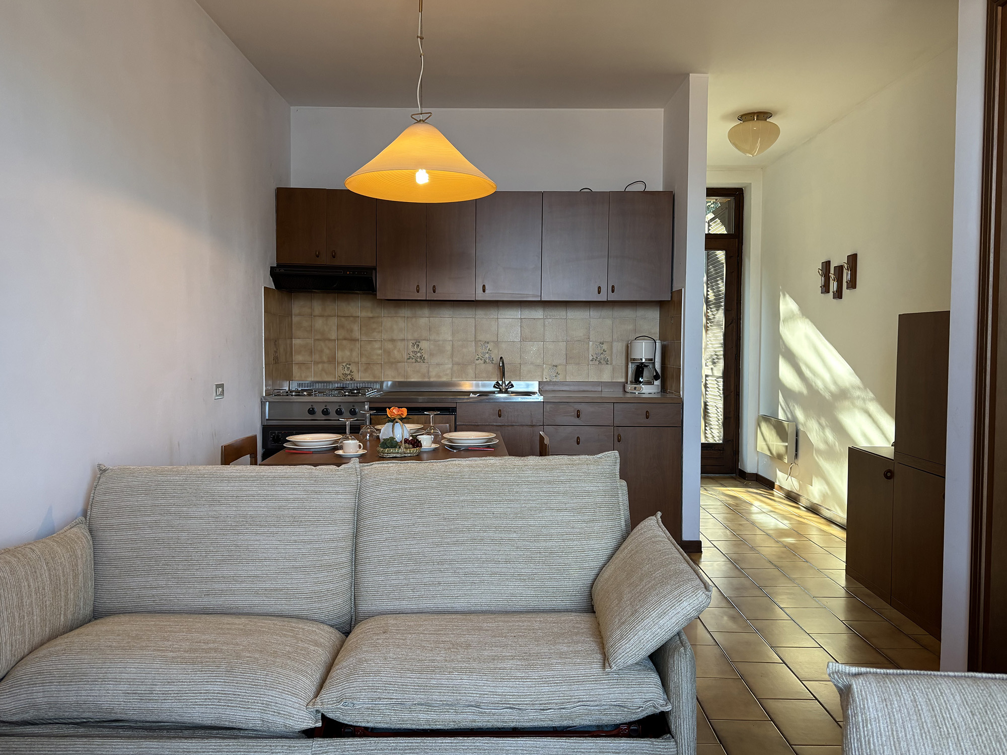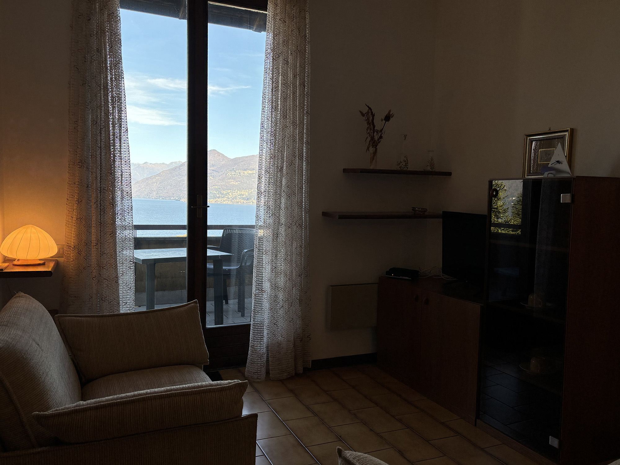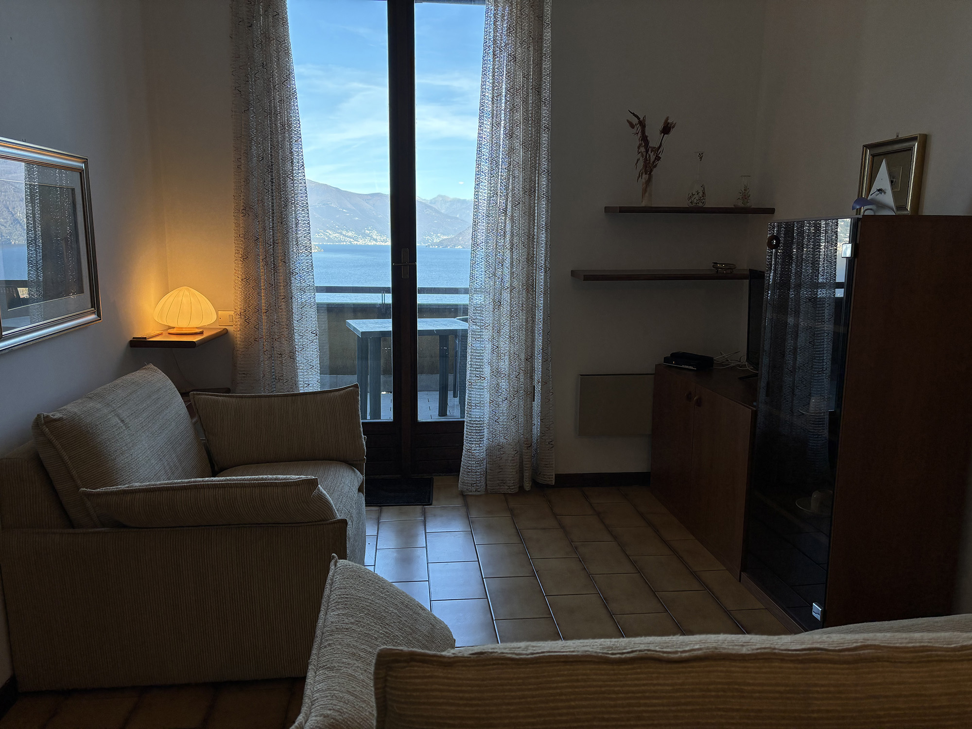 Im ersten Stock eines der Häuser befindet sich eine rustikale Zweizimmerwohnung mit einer Fläche von ca. 45 m² und herrlicher Aussicht auf den Lago Maggiore dank des großen Balkons. Sie besteht aus einem Wohnzimmer mit einem bequemen Einzelschlafsofa, angeschlossenem Essbereich und funktionaler Küchenzeile, einem Badezimmer mit eingebauter Badewanne und einem Schlafzimmer mit insgesamt zwei Betten.