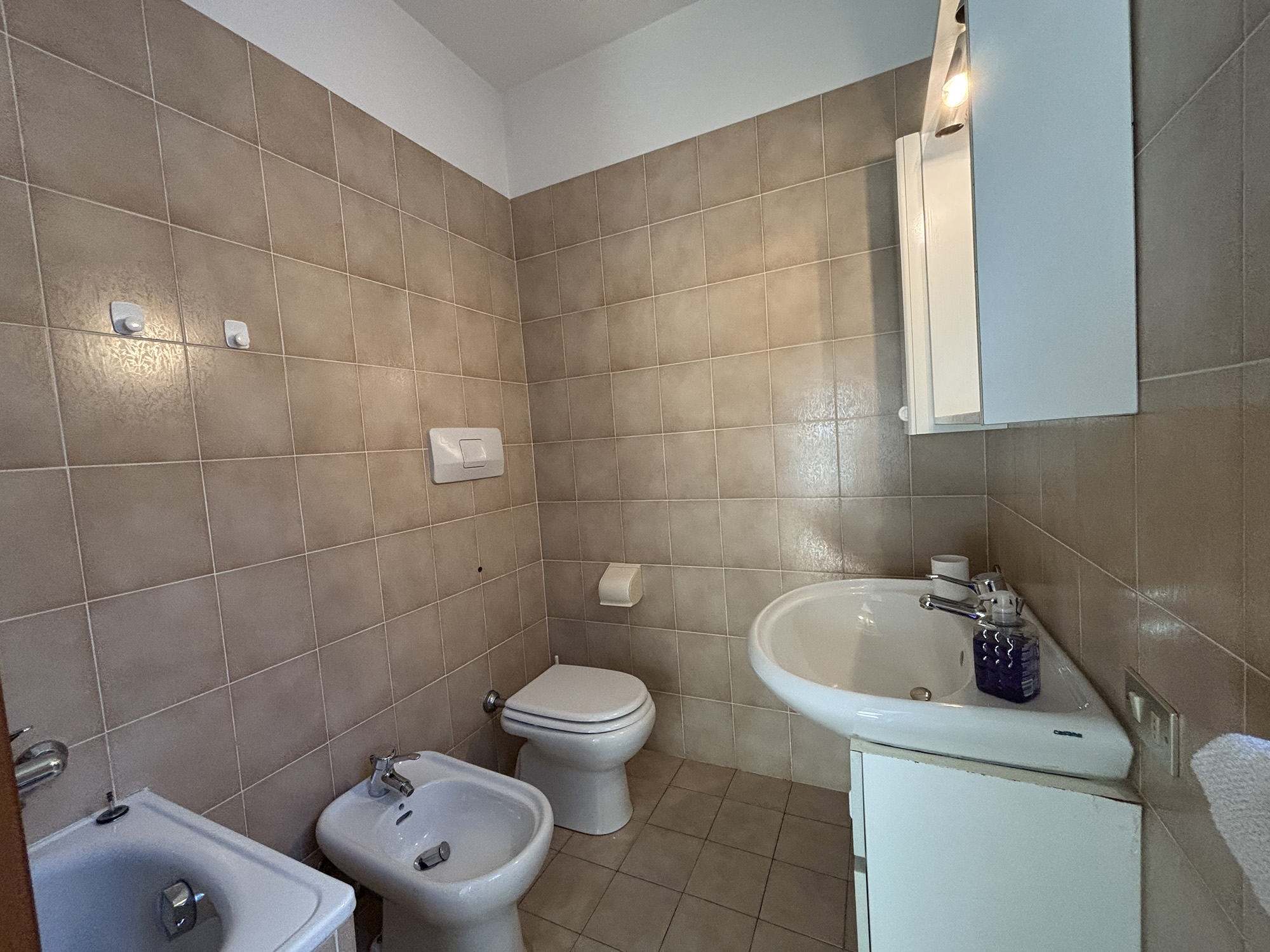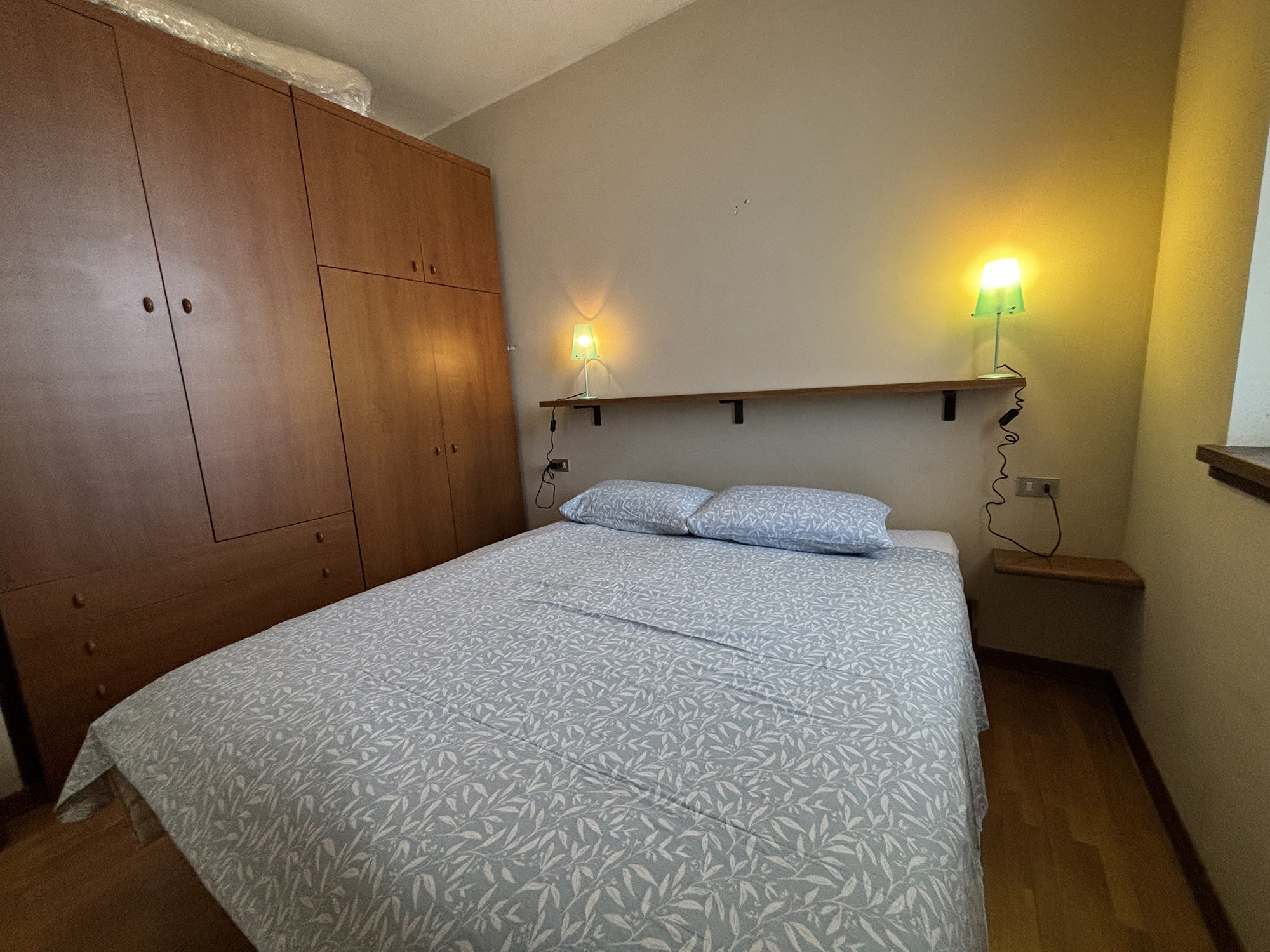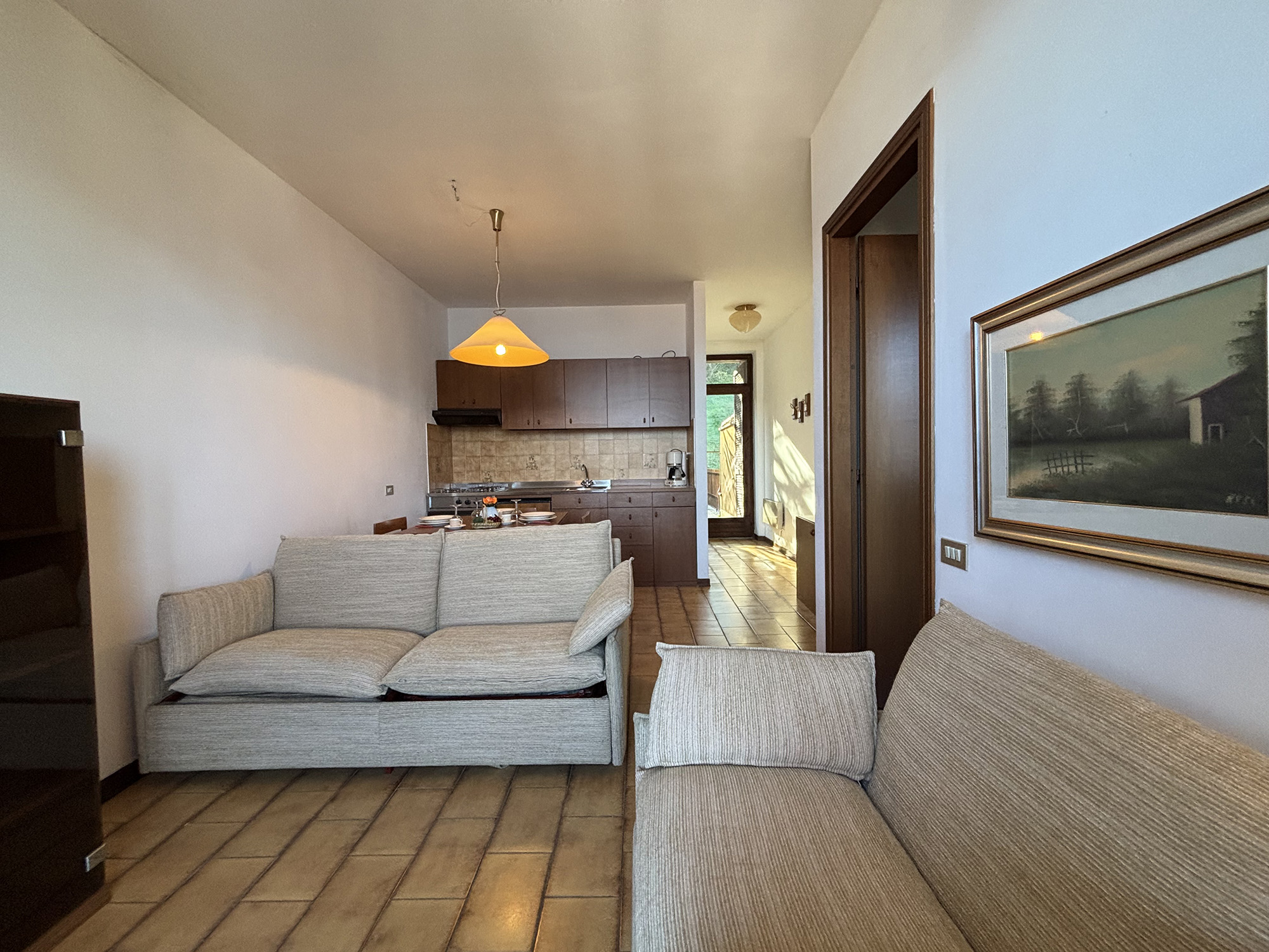 Im ersten Stock eines der Häuser befindet sich eine rustikale Zweizimmerwohnung mit einer Fläche von ca. 45 m² und herrlicher Aussicht auf den Lago Maggiore dank des großen Balkons. Sie besteht aus einem Wohnzimmer mit einem bequemen Einzelschlafsofa, angeschlossenem Essbereich und funktionaler Küchenzeile, einem Badezimmer mit eingebauter Badewanne und einem Schlafzimmer mit insgesamt zwei Betten.
